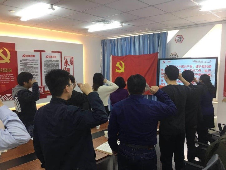 会前,机关党支部书记李富童带领全体人员重温入党誓词,面向党旗进行庄严宣誓。