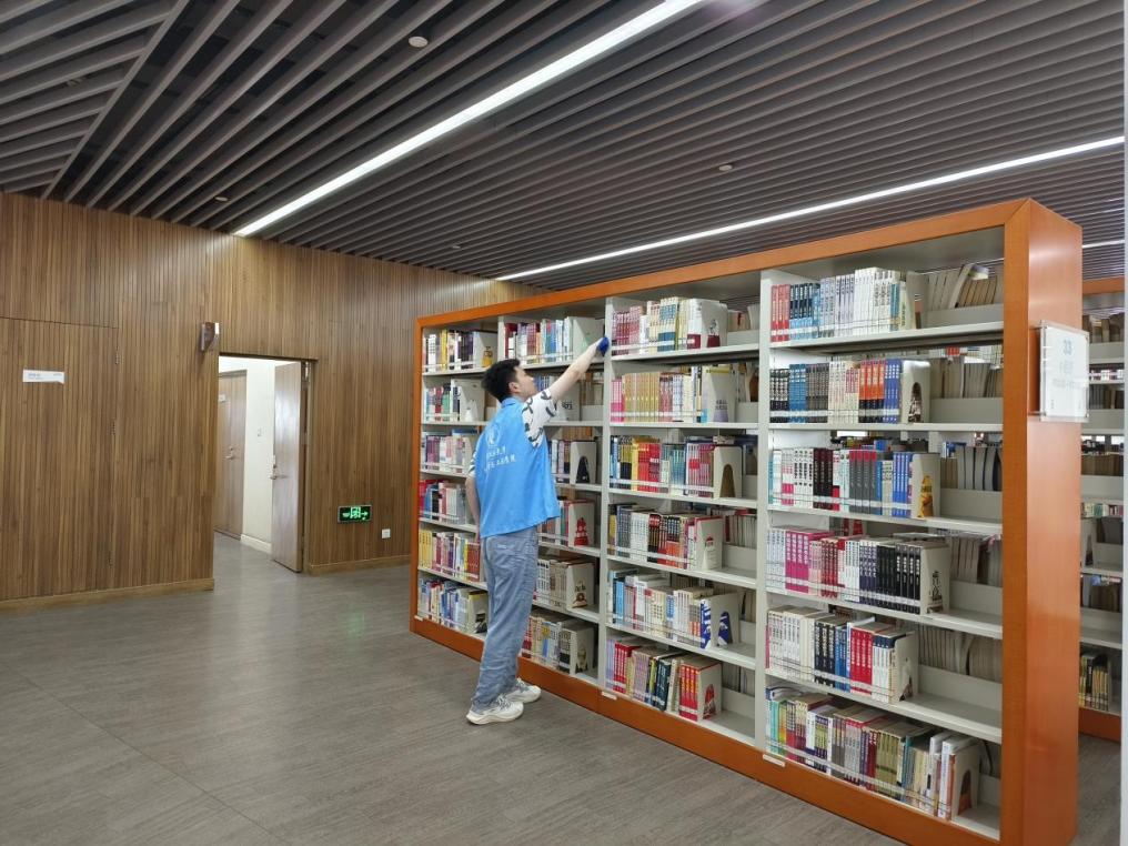 在清扫的过程中,同学们被分成几小组,每个小组负责一楼层的清扫区域。大家用心地清理着地上的纸屑和书架上的灰尘,尽可能让图书馆恢复它的整洁与舒适。