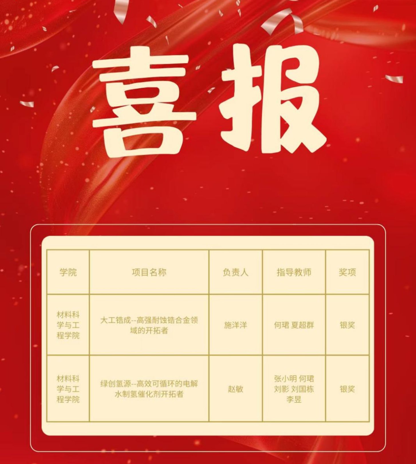 10月29日至11月2日,第十四届“挑战杯”秦创原中国大学生创业计划竞赛在西安交通大学举行。我院学子不畏挑战、载誉而归,凭借项目《大工锆成--高强耐蚀锆合金领域的开拓者》和《绿创氢源--高效可循环的电解水制氢催化剂开拓者》荣获两项国赛银奖!