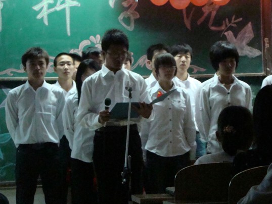 下午的比赛,材料学院09级学生导员许海媚老师也来到现场,观看了下半场的比赛,下半场的比赛更为精彩,各个班级话剧更加体现出了当代学生对老一辈的革命先辈的深情怀念。朗诵的同学们感情激昂,语调沉稳,红歌的合唱响起,一次又一次的把现场气氛推向了高潮。