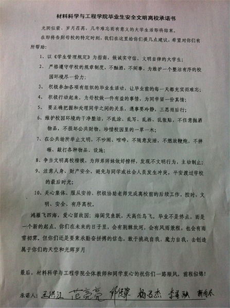 6月19号,学院在学生要求和老师期望的情况下统一印制了“材料科学与工程学院毕业生安全文明离校承诺书”。