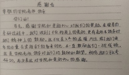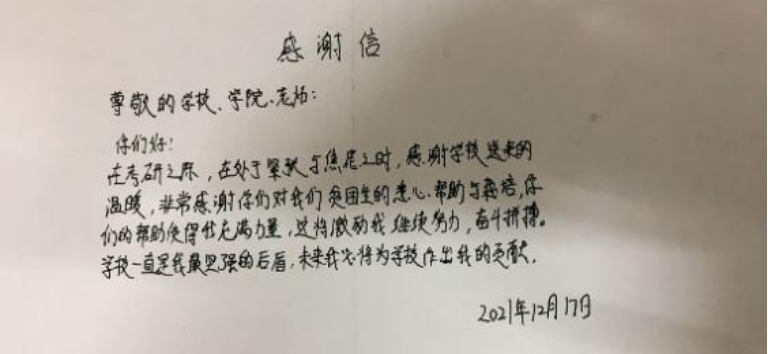 会后,收到温暖的同学们手写了感谢信和广发朋友圈,学生们表示备受鼓舞,考研的信心更足了,同时对学院和学校资助中心的温暖表示感谢。