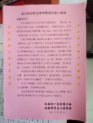 活动现场,学院党委书记尹宗毅、党委副书记王建昆、王珺和李昱老师为每位考研学生送上精心准备的橙子和“致考研学子的一封信”,通过这种问候,使考研同学感受到了材料学院大家庭的温暖。考研学子备受感动和鼓舞,同学们脸上洋溢着笑容,纷纷表示感谢,表示一定会坚定信心,继续努力,以优异的成绩回报学院的关心和培养。