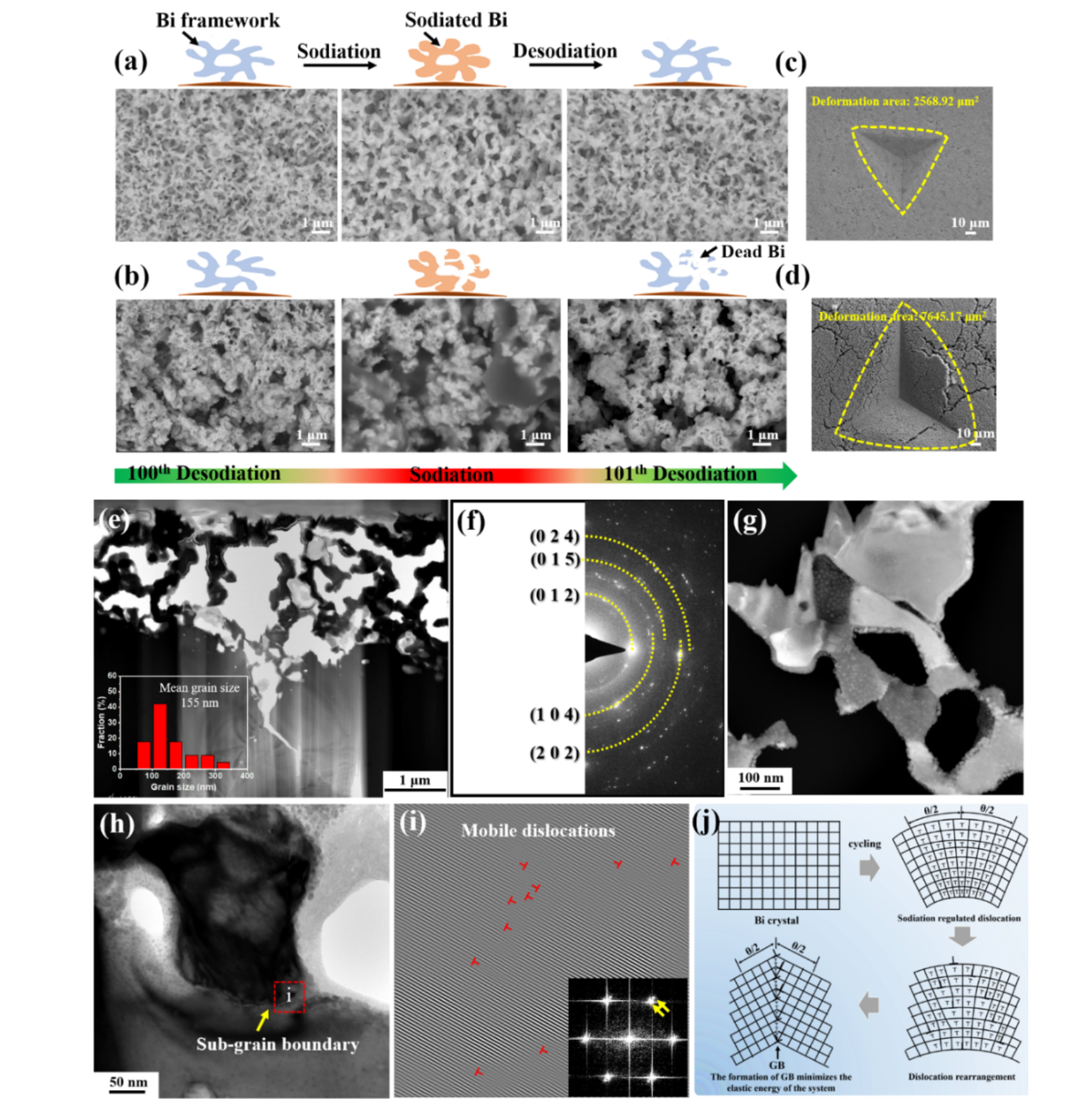 图5 结构稳定性的循环机制。a,b,循环100次后的Bi-UF和Bi-S在嵌钠/脱钠过程中的截面SEM图。c,d,循环100次后经过微米压痕的Bi-UF(c)和Bi-S(d)的表面SEM图。e,循环100次后Bi-UF的FIB-TEM横截面图像及相应的晶粒尺寸分布。f,相应的选区电子衍射(SAED)图样。g,局部区域的暗场(DF)TEM图。h,显示亚晶界的高分辨TEM图。e,(h)图中红框标记区域的高分辨率TEM和反傅里叶变换(IFFT)图像。j,储钠过程中GBs的形成机理。
