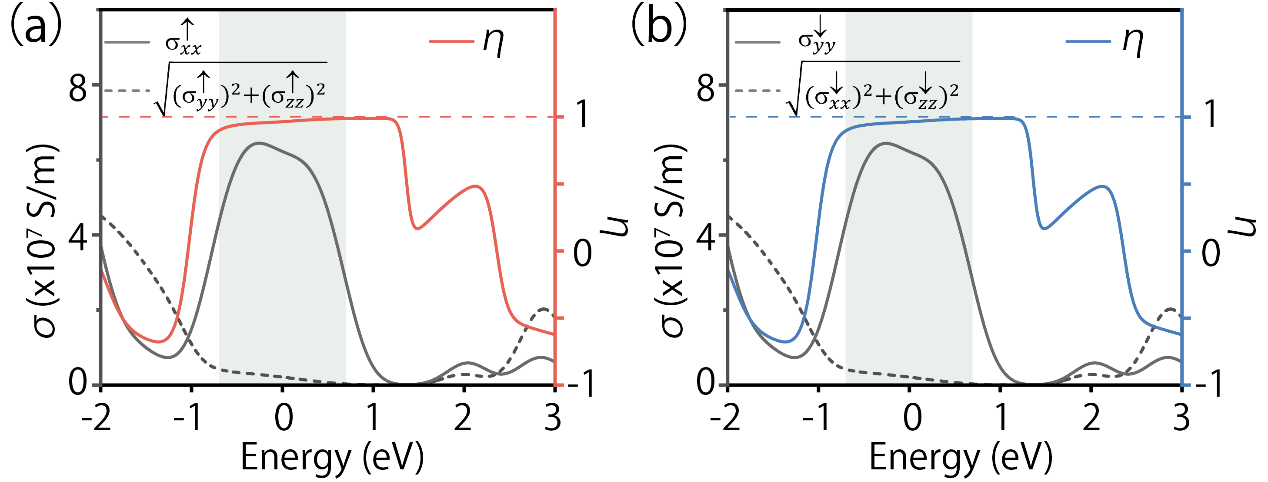 。更重要的是每个自旋通道中的电子电导率的各向异性在节线网(费米能级)附近极大增强,其中