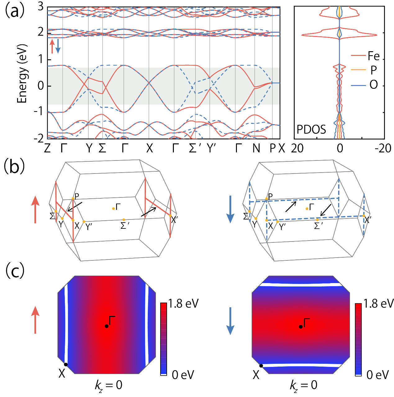 图3 (a) β-Fe2(PO4)O 的能带结构和投影态密度。绿色高亮区域表示 Z3 交错磁性的节线网出现的能量区间。(b) 上自旋和下自旋通道中 Z3交叉节线的形状。这两条 Z3 交叉节线形成了一个 Z3节线网。(c) 在 kz = 0 平面上,上下自旋通道的 Z3节线形状,如 (b) 中的箭头所示。