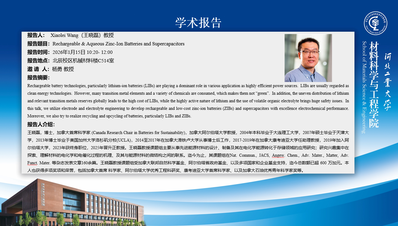2026年1月15日上午,加拿大阿尔伯塔大学(University of Alberta)王晓磊教授应邀在北辰校区机材料 C514 会议室为我校师生作题为《Rechargeable & Aqueous Zinc-Ion Batteries and Supercapacitors》 的学术报告。本次报告由材料学院副院长杨勇教授主持,学院教师、研究生及本科生等近百人参加,现场学术氛围浓厚。
