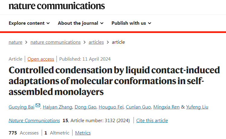 4月11日,kaiyun体育官网登录入口材料学院白国英教授课题组在《Nature Communications》上发表题为“Controlled condensation by liquid contact-induced adaptations of molecular conformations in self-assembled monolayers”的高水平论文,并被刊登在《Nature Communications》编辑精选网页(旨在展示一个领域最近发表的50篇最好论文)上。kaiyun体育官网登录入口材料科学与工程学院天津市层状复合与界面控制技术重点实验室为第一完成单位。