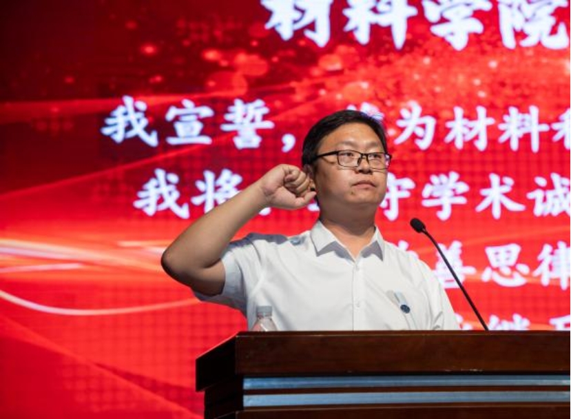 典礼最后,全体师生共同宣誓。庄严的誓词背后是材料科学与工程学院对于学生成长的关注和对学生未来的期望。全体师生举起右拳,目光坚定,挺拔的身姿展现了材料师生的坚定信念!