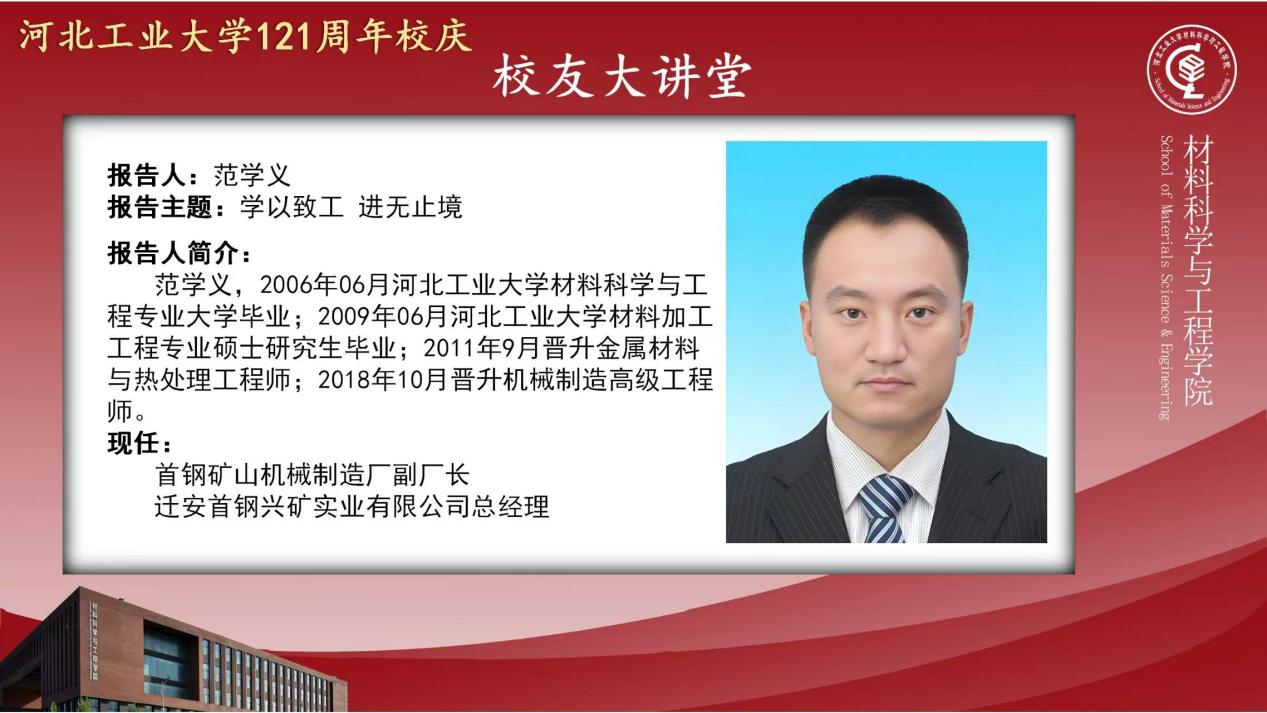 上午10点,“校友大讲堂”在机材楼C514开讲,铸造02级校友、首钢矿山机械制造厂副厂长、迁安首钢兴矿实业有限公司总经理范学义应邀做了以《学以致工,进无止境》为主题的分享。材料科学与工程学院院长郑士建、副院长董斌、王新、学院教师赵维民教授、王志锋教授、综合办公室主任李妍、学工办主任兼团委书记李昱、辅导员王珺、北京校友会校友代表张月明以及100余名学生代表参加了报告,报告会由材料科学与工程学院正处级辅导员张雪莹主持。