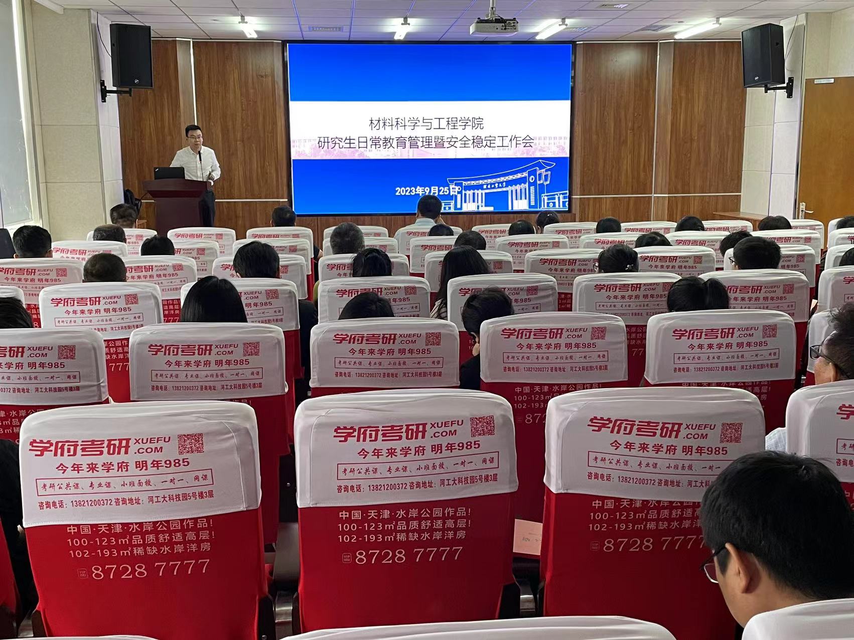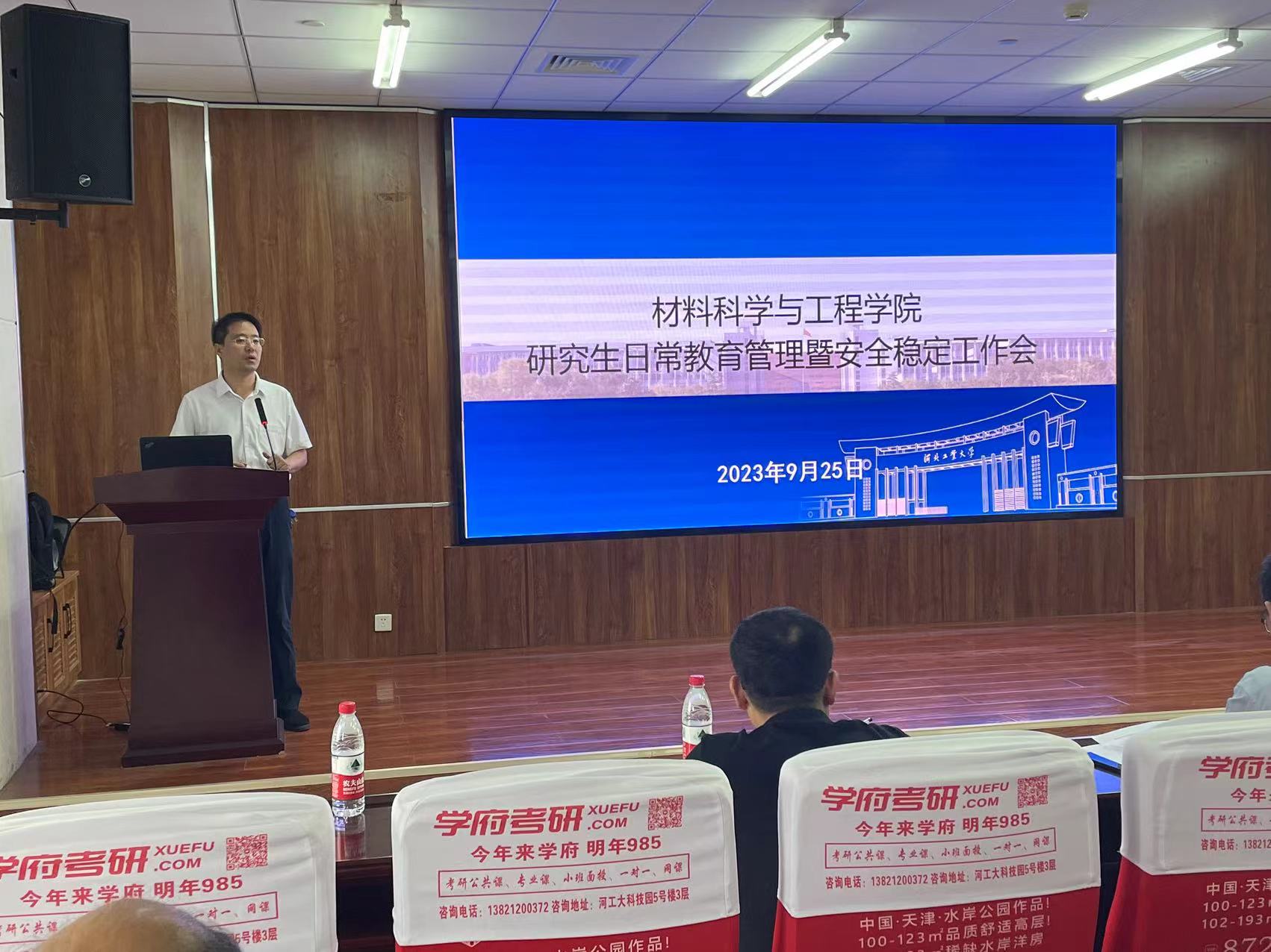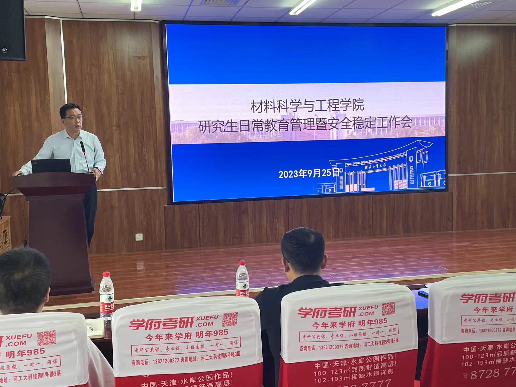 2023年9月25日上午材料科学与工程学院研究生日常教育管理暨安全稳定工作会在北辰学院楼召开,材料科学与工程学院党委书记赵庚,院长郑士建,正处级辅导员张雪莹,副院长杨勇,副院长夏兴川,全体研究生指导教师,研究生辅导员吕颖,研究生教务秘书侯庆华参加了会议,杨勇主持会议。