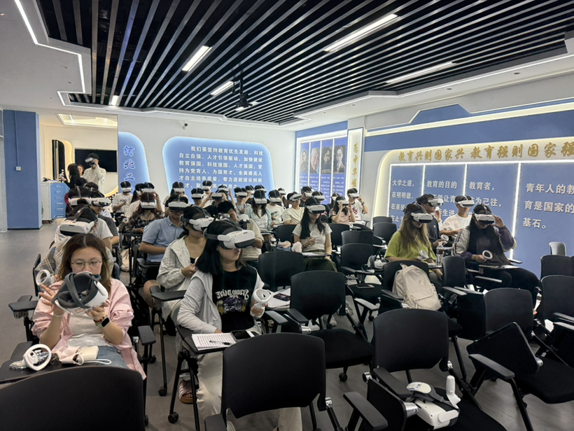 在实验室配备的智能交互头盔与手势追踪设备支持下,学员们以第一视角“穿越”至中共一大纪念馆数字展厅,通过全息投影技术观摩《共产党宣言》首译本等文物,真实感受爱国主义教育基地的育人场景,当“踏上”泸定桥时,木板的晃动感和耳边的枪炮声,同学们对“革命理想高于天”又增添了全新的认知。