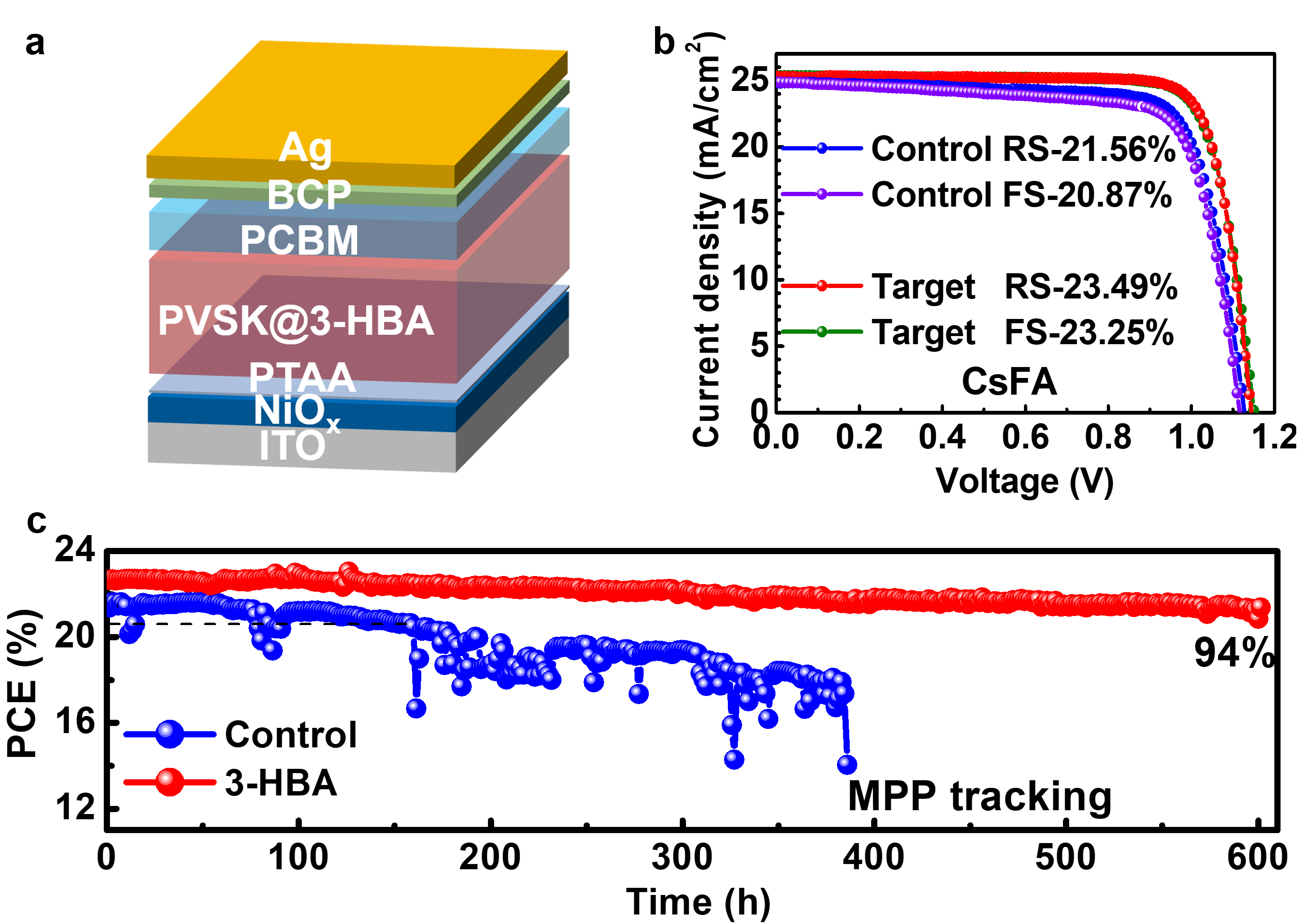 研究人员通过制备不同结构,不同组分的钙钛矿光伏电池,通过测试其性能,发现3-HBA是一种通用的缺陷钝化剂,与器件结构和钙钛矿成分无关。并且经过3-HBA修饰的器件运行稳定性极佳,最大功率点跟踪601小时后仍保持初始效率的94%。