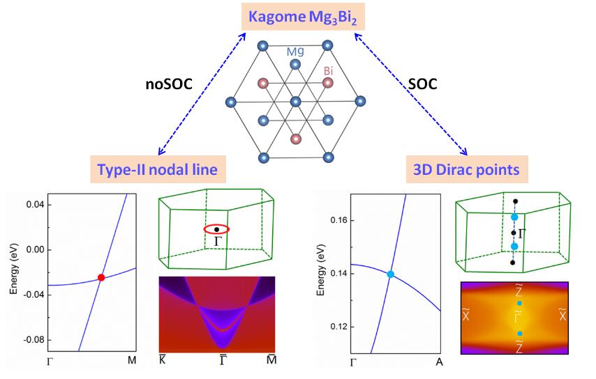 拓扑半金属(或金属)材料无疑是当前材料科学以及物理学最热点的研究方向之一,也是我国当前重点关注的科学研究领域。不同于传统的半金属材料,拓扑半金属在费米能级附近具有非平庸的能带交叉,导致电子拥有奇特的输运行为。尤其,拓扑半金属对于未来量子计算的实现被寄予厚望。契合未来应用,开发出同时具有良好材料特性和拓扑特性的候选材料成为当前拓扑半金属这一领域发展的重要方向。拓扑半金属中,根据能带交叉附近的色散,可以将交叉点分成type-I和type-II两类。这两类交叉点附近的电子具有迥异的拓扑电子行为,对应着不同的应用方向。多种类型的拓扑半金属中,比如Weyl半金属、Dirac半金属,都已经开发出了type-I和type-II的实际候选材料。然而,长久以来,具有type-II型色散的拓扑节点线半金属却没有在稳定的实际材料中发现。近期,我院张小明老师(第一作者)、研究生靳蕾、代学芳研究员、刘国栋教授(通讯作者),国际上首次预言了稳定的、具有Kagome结构的Mg3Bi2材料中可以实现type-II型节点线,填补了该类拓扑半金属没有实际稳定候选材料的空白。除了type-II节点线的存在,他们还发现Mg3Bi2中还存在着一对三维Dirac点,使得该材料作为拓扑半金属具有更广阔的应用前景。上述理论工作发表不足两月,Mg3Bi2中type-II的节点线就被国际著名实验研究组从实验中证实。