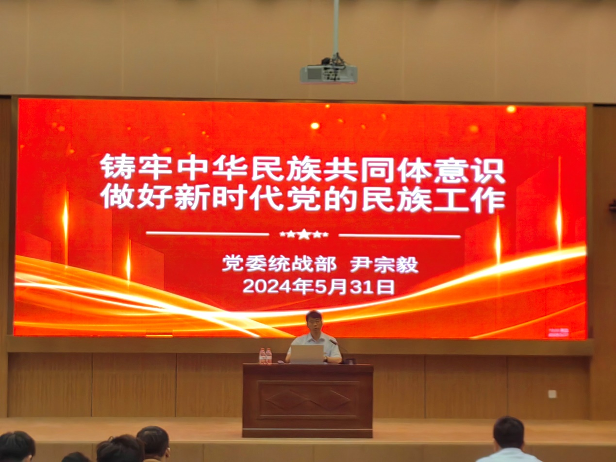 2024年5月31日,材料科学与工程学院2023-2024学年春季学期党校培训第五讲在机材楼报告厅开展。本次培训以“铸牢中华民族共同体意识,做好新时代党的民族工作”为主题,邀请了校党委统战部常务副部长尹宗毅同志担任主讲人。本次党课由学院党委书记赵庚主持,学院预备党员、发展对象、积极分子及来自校机关的部分老师近二百人参会。
