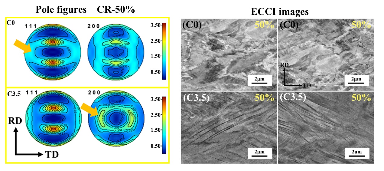 间隙原子强化高熵合金以其卓越的机械性能(包括高强度、高延展性)以及独特的功能特性,成为了材料科学的研究前沿。在轧制态合金中,晶体学取向分布和微观组织结构对合金的最终综合性能起着决定性作用。因此,深入理解轧制过程对合金性能的影响机制对于推动间隙原子(特别是碳间隙原子)强化高熵合金的开发与应用具有重要意义。因此,联合研究团队基于Fe、Mn、Co、Ni四种元素相对较低的碳亲和力,设计了无碳化物形成的(FeMnCoNi)96.5C3.5合金,并以FeMnCoNi合金为对比试样,利用中子衍射技术研究了碳间隙原子对高熵合金轧制变形组织的影响。中子衍射技术可以提供高统计性晶体学取向分布信息,包括内部和表面晶粒,晶粒数量可以达到109个,使得块状样品平均织构结果比使用X射线衍射和电子背散射衍射的结果具有更高的统计性和可重复性。团队通过RESA中子衍射实验清楚地捕捉到了碳间隙原子所引起的晶体学极图差异(图下图所示)。发现,尽管在形变早期阶段含碳和不含碳高熵合金的组织特征相似,但在50%冷轧变形量后,含碳合金的Brass和Goss织构明显高于无碳合金,而Copper织构和S织构组分含量较低,碳间隙原子诱导的大量孪晶是变形织构形成明显差异的主要原因。此项工作对于揭示碳间隙原子对高熵合金组织演变的影响规律以及微观组织与性能优化提供了坚实的理论支撑。