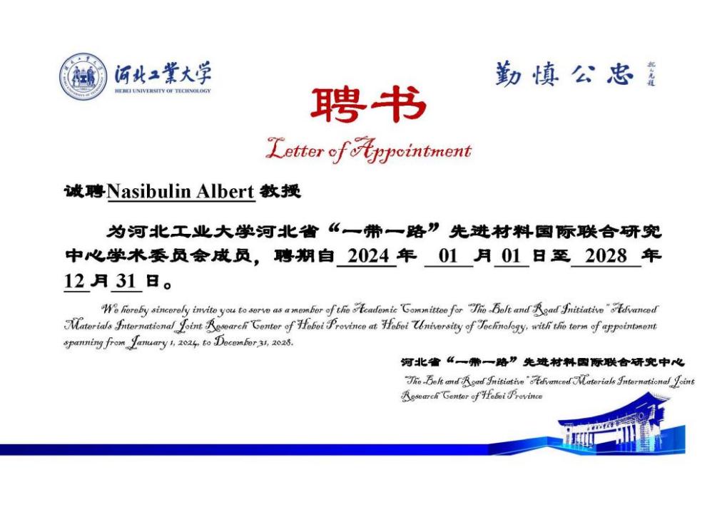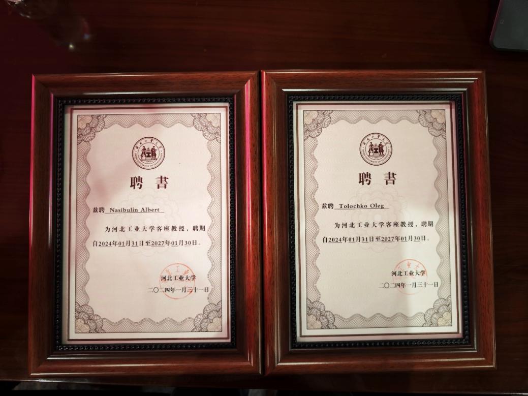 与中心保持密切合作关系的俄罗斯及乌兹别克斯坦多所知名院所均派代表亲临现场参会,广东省科学院及我校教授代表以线上方式参加。中心主任王清周教授首先向与会者全面介绍了中心的发展历程、组织架构、研究方向、已取得的科研成果以及短期与长期建设目标,随后隆重介绍了中心学术委员会成员组成:广东省科学院殷福星教授担任学术委员会主席,乌兹别克斯坦科学院阿里福夫离子等离子体和激光技术研究所 Kurbanov 教授、kaiyun体育官网登录入口材料科学与工程学院郑士建教授、俄罗斯圣彼得堡彼得大帝理工大学 Tolochko 教授以及俄罗斯莫斯科斯科尔科沃科技学院 Nasibilin 教授担任学术委员会委员。接着,王清周教授为到场委员颁发了学术委员会委员聘书。学术委员会委员 Tolochko 教授和 Nasibilin 教授基于与我校长期有效的合作,已于今年被特聘为我校客座教授,此次学术委员会会议上,王清周教授代表学校为他颁发了特聘教授聘书。