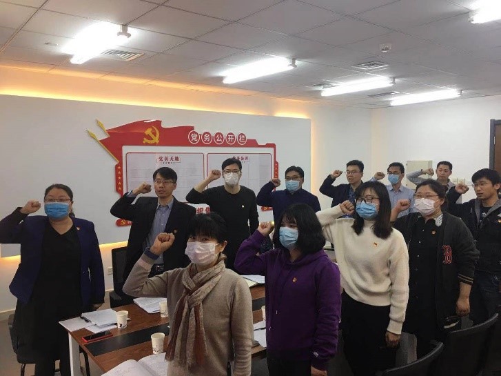 会前,机关党支部书记李富童带领全体人员重温入党誓词,面向党旗进行庄严宣誓。