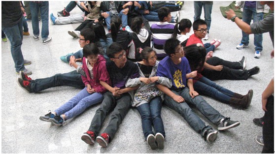3、人椅:坐与躺之间每一个人都在不知不觉中贡献了自己的力量,极大程度的体验到了团队精神,