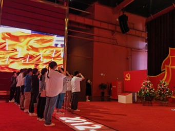 在讲解员引领下,师生党员步入气势恢宏、象征长征精神的“时空隧道”,见证从中国共产党成立至今新中国的诞生、发展、一路前行的光辉历程。随后在张雪莹老师的带领下,所有师生面向党旗、高举右拳,在毛主席雕像前庄严宣誓,重温入党誓词,共忆入党初心。