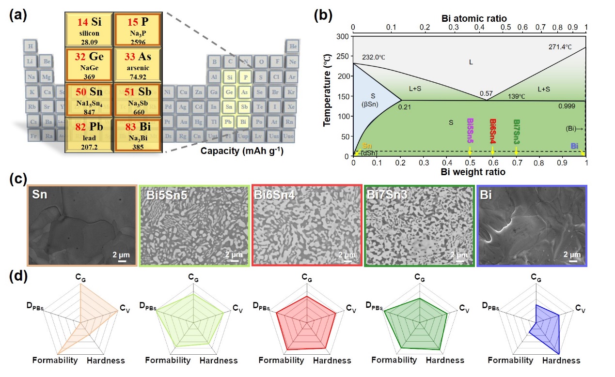 图2 不同成分Bi-Sn合金的共晶PBs设计。a,可用于SIBs合金化反应的元素。b,Bi-Sn合金的共晶相图。c,不同比例的Bi-Sn合金的SEM图。d,相应合金的理论容量、PBs密度和显微硬度的比较。