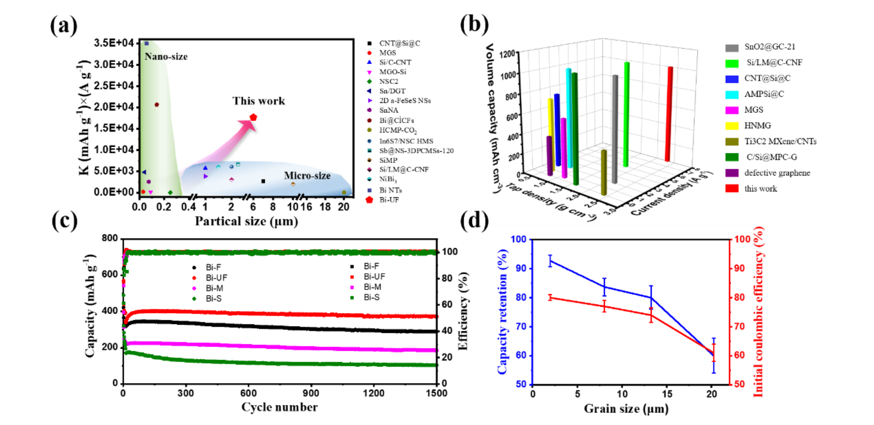 图3 微尺寸Bi负极的电化学性能。a,Bi-UF负极与之前报道的负极的K值比较。K因子定义为比容量×电流密度,用于评估高电流密度下的容量传输能力与颗粒尺寸的关系。b,Bi-UF负极的体积比容量和电极振实密度与之前报道的负极的对比。c,循环性能。d,ICE和循环容量保持率与晶粒尺寸的关系。