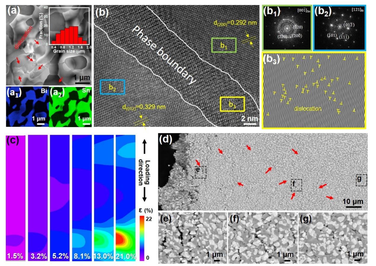 图3 Bi6Sn4合金的微观结构和机械性能。a,TEM图和相应的元素分布图(a1、a2)。b,HRTEM 图像和相应的SAED样。b3,(b)中PBs(黄色矩形b3)的IFFT图。c,拉伸过程中的应变分布。d-g,Bi6Sn4条带拉伸样品断裂前沿的SEM图。