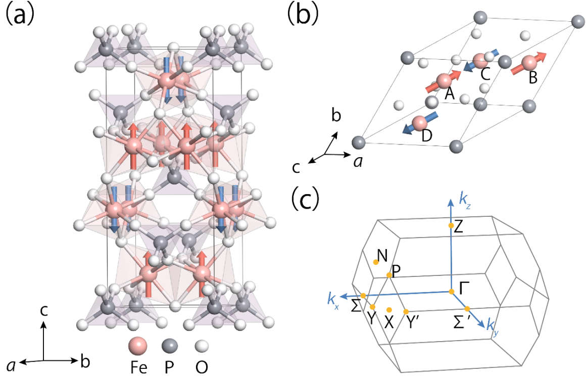 图2 (a) β-Fe2(PO4)O 的单胞和 (b) 原胞。红色和蓝色箭头分别表示上自旋和下自旋的磁矩。(c) 表示布里渊区。