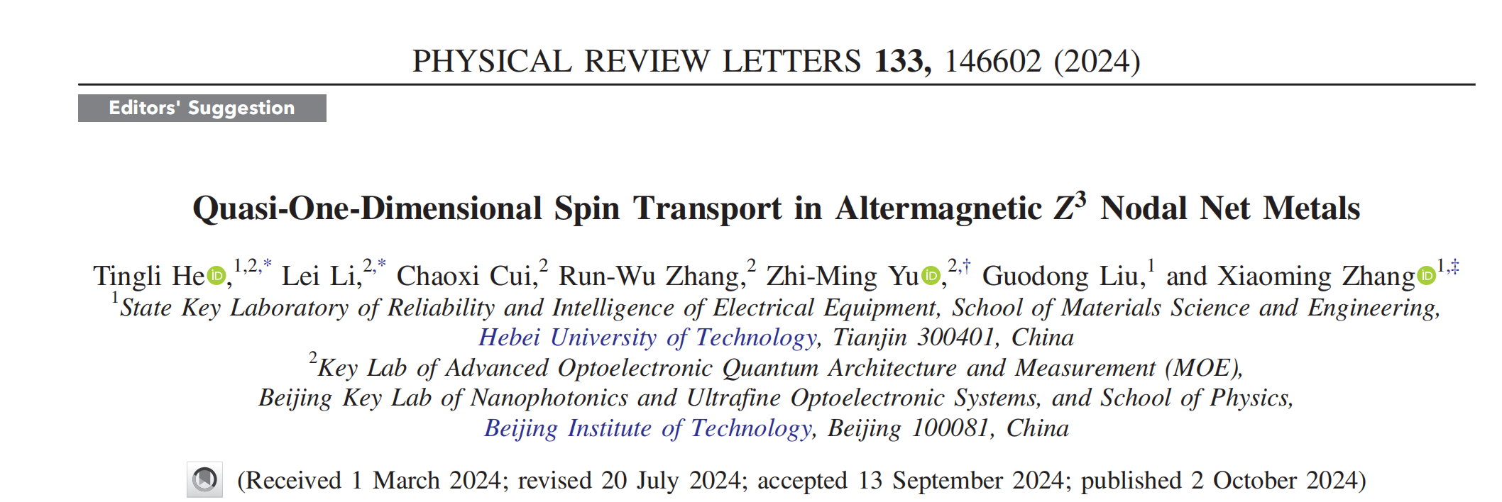 近日,材料科学与工程学院新型电子功能材料团队与北京理工大学合作在物理类顶刊《Physical Review Letters》上发表了题为“Quasi-One-Dimensional Spin Transport in Altermagnetic Z3 Nodal Net Metals”的研究型论文(入选Editors’ Suggestion)。kaiyun体育官网登录入口为第一完成单位,材料科学与工程学院博士生何婷丽与北京理工大学李磊博士为论文共同第一作者,张小明教授与北京理工大学余智明教授为论文共同通讯作者。