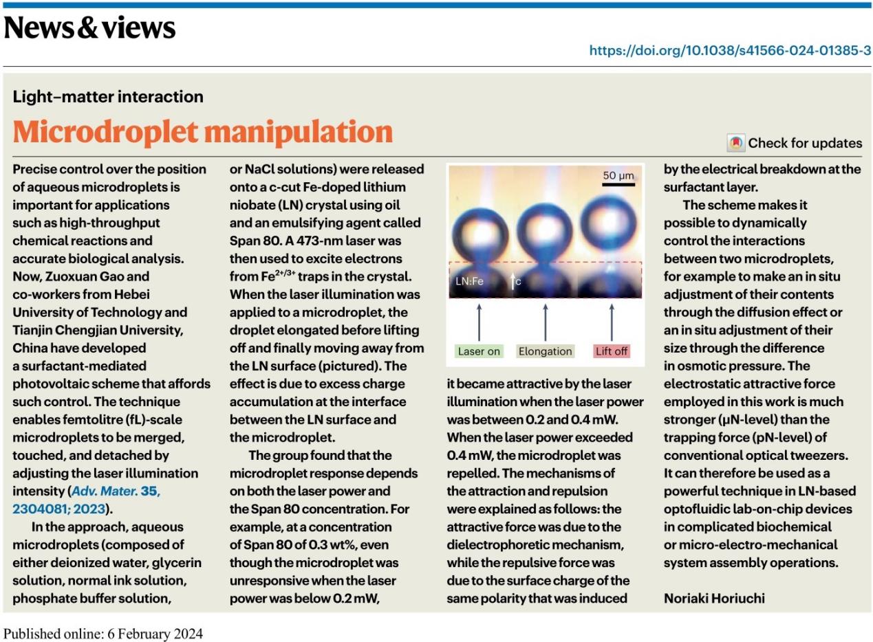 光子微流控芯片集生物培养、输运及检测功能于一体,可快速、高效地实现对单细胞的操控、分类和检测分析。材料科学与工程学院阎文博研究员团队提出的表面活性剂辅助的光伏微流体操控技术,可实现飞升体积水合微液滴在油相中的复杂操控与组装。该技术既不需要外部电源供电也不需要复杂电极制备,显著优于数字电路驱动的传统微流控技术,与光镊操控相比,该技术具有作用力强、所需光功率低、可串/并行切换、可非局域调控等优点,从而使得铌酸锂基光子微流控芯片、微机电系统的设计与制备成为未来光子学发展的一个新方向。基于以上研究成果,阎文博研究员团队在顶级期刊《Advanced Materials》上发了表题为“Efficient Surfactant-Mediated Photovoltaic Manipulation of fL-Scale Aqueous Microdroplets for Diverse Optofluidic Applications on LiNbO3 Platform”( 原文链接:https://doi.org/10.1002/adma.202304081)高水平论文。kaiyun体育官网登录入口省部共建电工装备可靠性与智能化国家重点实验室为论文第一完成单位,阎文博研究员为论文唯一通讯作者,其博士研究生为论文第一作者。该工作一经发表便引起了学界的广泛关注,《Nature Photonics》资深编辑Noriaki Horiuchi在News & views栏目中对该工作进行重点专题推介(原文链接:https://doi.org/10.1038/s41566-024-01385-3)。