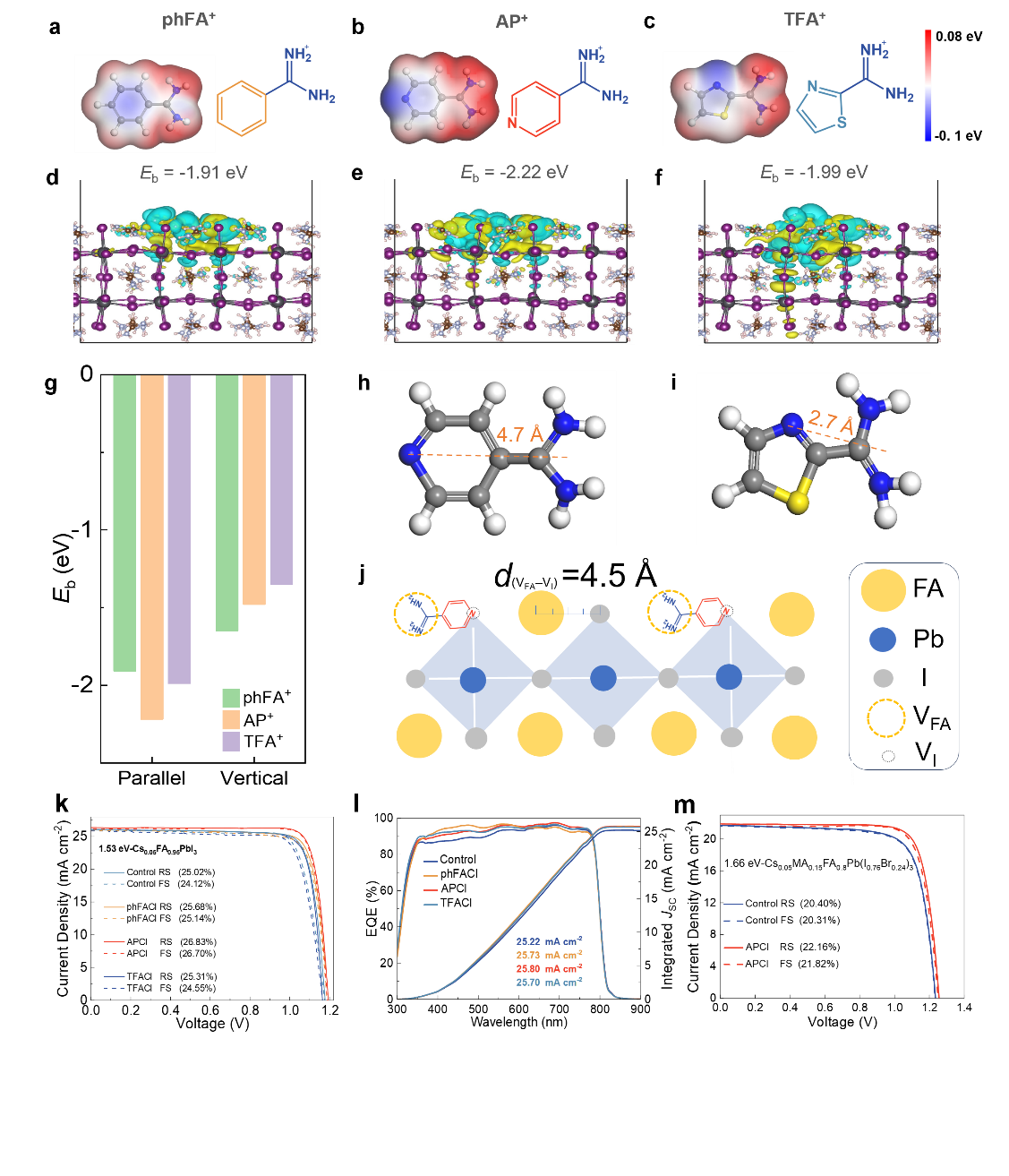 图1不同脒基阳离子与钙钛矿相互作用的理论研究及脒基钝化剂对钙钛矿太阳能电池性能和特性的影响。