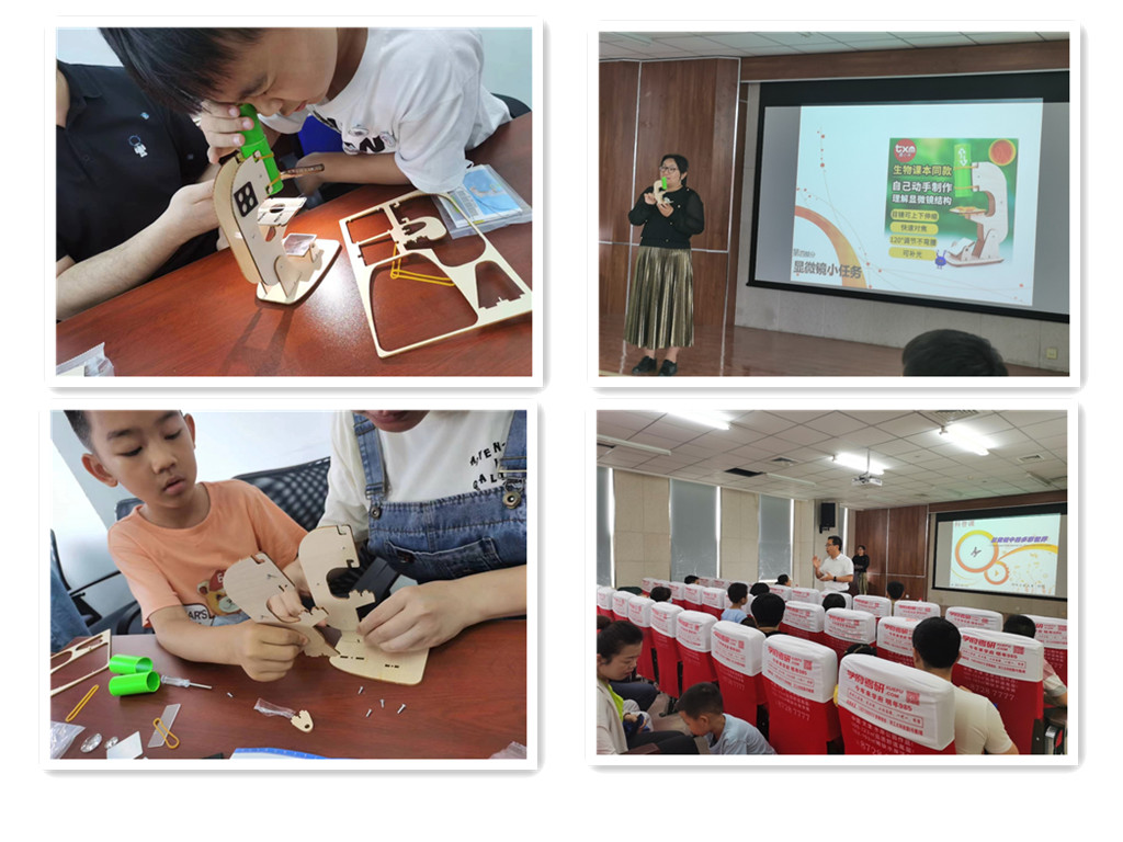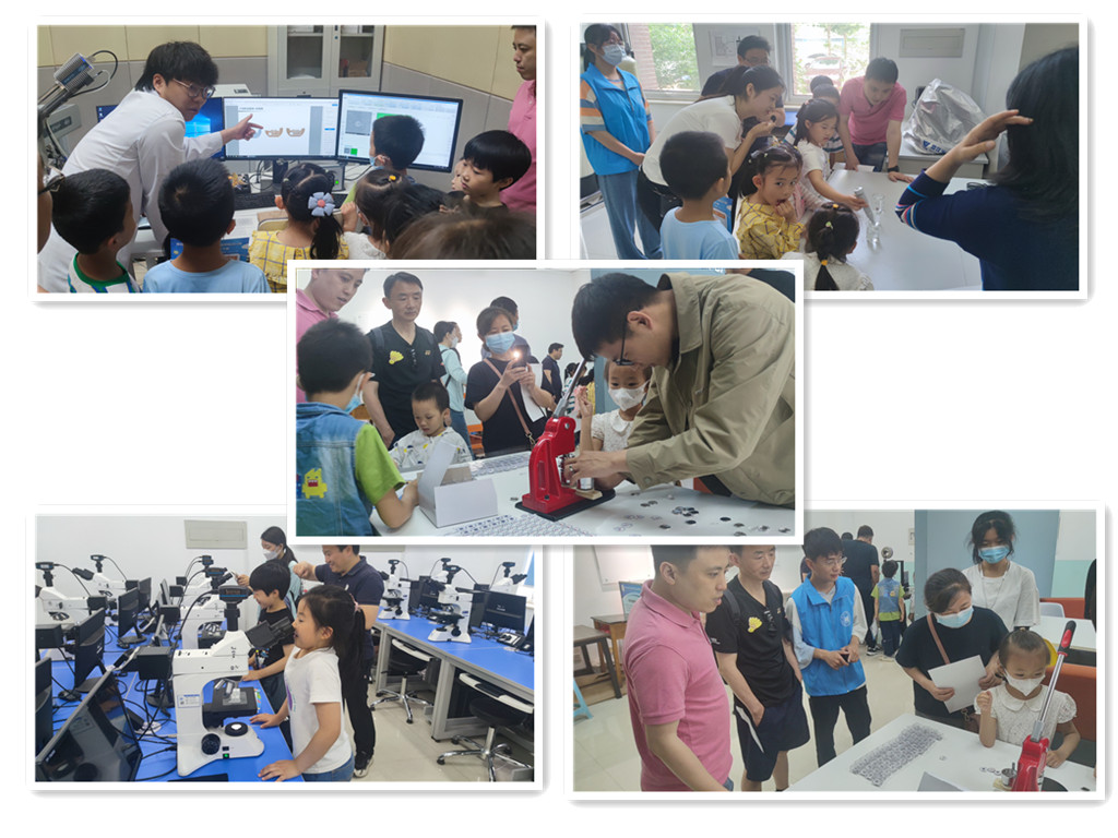 本次家属开放日采用参观盖章打卡的形式,由张雪莹、何珺、李昱带领教师及家属从kaiyun体育官网登录入口北辰校区图书馆开始参观;随后带队前往机材楼,参观了分析测试中心的电镜实验室、聚集离子束实验室和XDR粉末衍射实验室;在C108组织科学小实验,测试了自来水、纯净水和去离子水的电阻率的大小,并学习了纯净水和去离子水的制备过程及用途;在C216创新工作室参观了3D打印机和激光雕刻仪冲压机;在C217用显微镜观察了许多生物标本;在三楼打卡点学习了铝空气电池组、锂电池组的成分组成,观察了太阳能风扇发电过程和方式,体验了手摇发电机,并且开展尾矿除色实验,生动地演示了尾矿对于水中有机染料的吸附原理;在C514由何珺进行科普宣讲。最后小朋友们在爸爸妈妈的带领下进行了显微镜的制作,并用他们亲手制作的显微镜进行了观察。