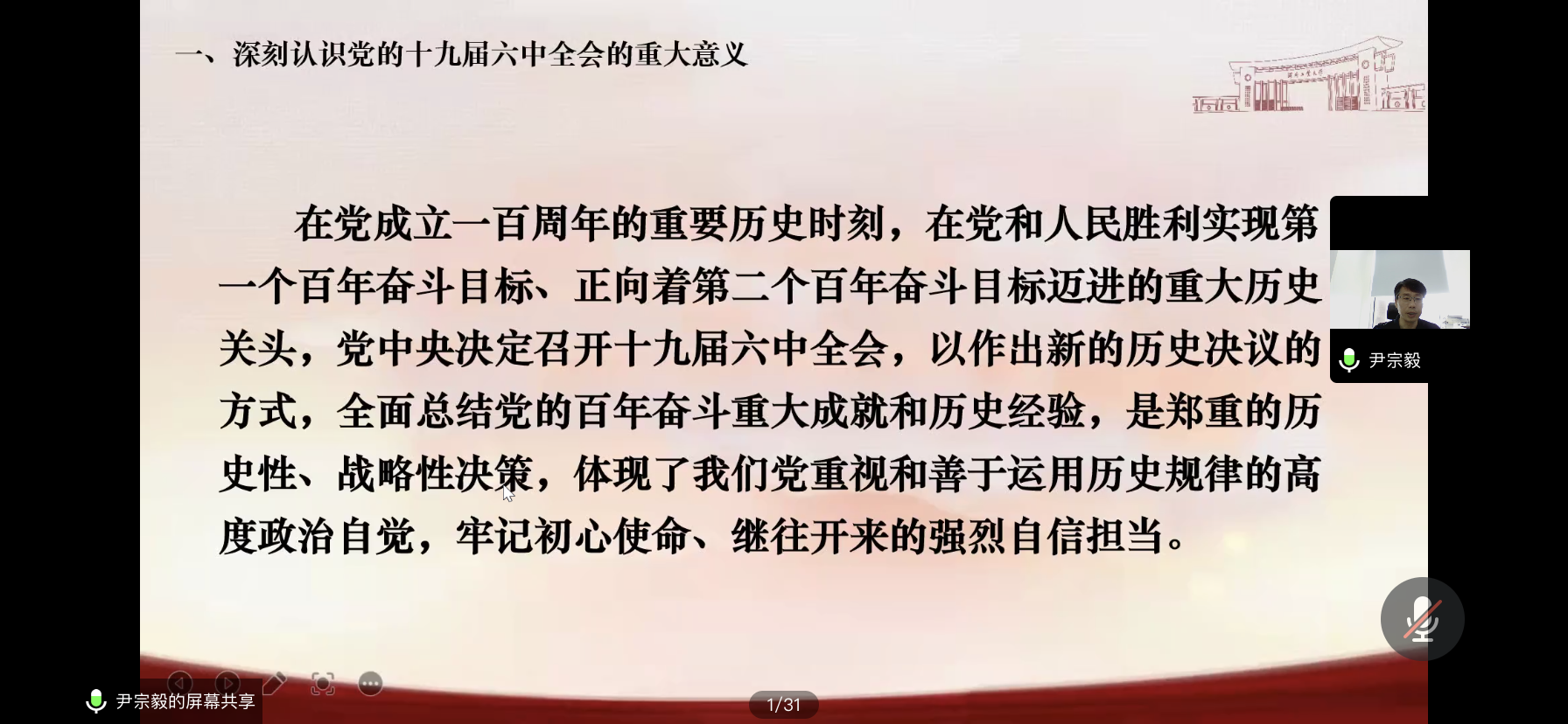 2022年7月6日下午15:00,材料学院党委组织全体师生党员利用腾讯会议开展学习贯彻党的十九届六中全会精神专题培训,培训由学院党委书记尹宗毅同志做题为《以史为鉴,担当作为,开创学院发展新局面》报告。