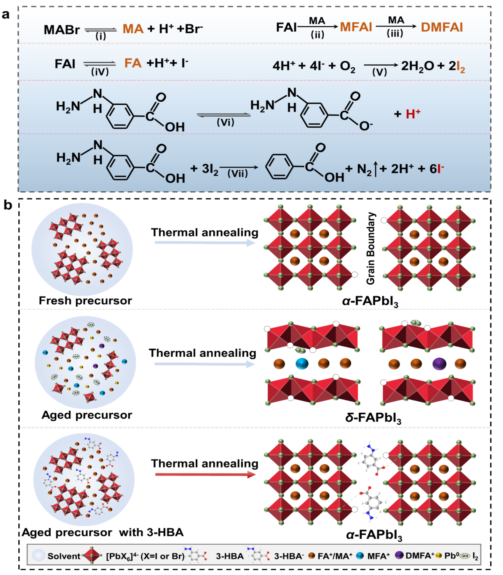 基于前期研究(Solar RRL, 2021, 5, 2100320.; J. Energy Chem., 2022, 69, 659-666.; Adv. Energy Mater., 2021, 11, 2100529.; Chem. Soc. Rev., 2021, 50, 7250-7329.等),研究者发现将含有-NHNH2和-COOH的3-肼基苯甲酸(3-HBA)能够有效稳定前驱体溶液。随后对其作用机理进行了探究,通过在前驱体溶液中添加各种含有-COOH或-NHNH2官能团的添加剂分子,对老化溶液制备的薄膜进行X射线衍射分析,对含有3-HBA以及苯甲酸的溶液进行核磁共振氢谱测试以及氢碘酸溶液的紫外吸收谱图测试,确定了3-HBA中的-NHNH2可以将碘单质缺陷还原为I-,从而抑制I-的氧化。3-HBA中的-COOH通过可逆平衡电离反应产生的H+可以抑制有机阳离子的去质子化和随后的胺-阳离子反应。通过-NHNH2和-COOH的协同作用同时抑制降解反应,从而稳定前驱体溶液。