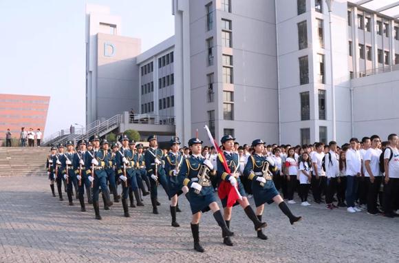 升旗仪式七点半准时开始。一声响亮的口号后紧随的是整齐有序的踏步声,蓝天国旗护卫队成员迈着整齐步伐,肩抗国旗,走向主席台。升国旗,唱国歌,指挥员的声音铿锵有力,响彻校园,国旗在《义勇军进行曲》的激扬伴奏中缓缓升起,同学们目光坚定,紧随国旗行注目礼,并高唱国歌。升旗仪式结束,材料科学与工程学院师生代表在主席台前合影留念,共同铭记这庄严的一刻。