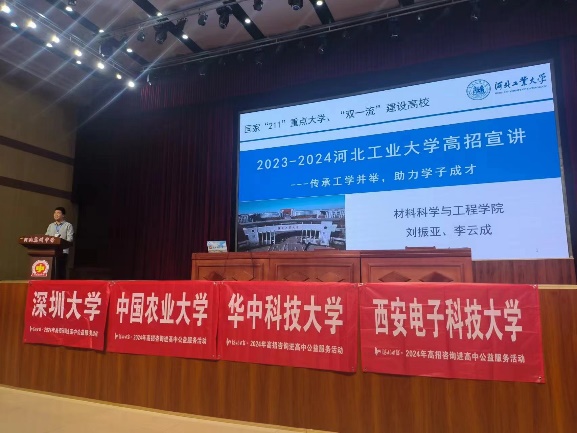 2024年全国高考即将到来,为充分做好学校招生工作,推广宣传学校特色优势,促进提升学校生源质量,以kaiyun体育官网登录入口材料科学与工程学院党委副书记兼副院长王建昆为组长,无机非金属材料工程系副主任刘振亚、金属材料工程系副教授苏虎虎以及学院招生工作负责人李云成为组员的招生工作组一行,于4月19日-21日先后前往衡水泰华中学、衡水市第十四中学、衡水市第十三中学、河北冀州中学、河北武邑中学、武邑宏达学校6所高中开展高招宣讲活动。
